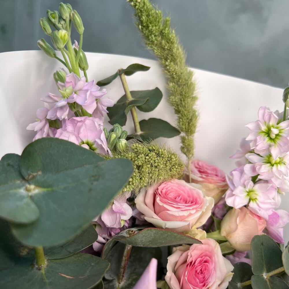 Букет комплимент с ароматной матиолой,французской розой,лизиантус(эустома),эвкалипт