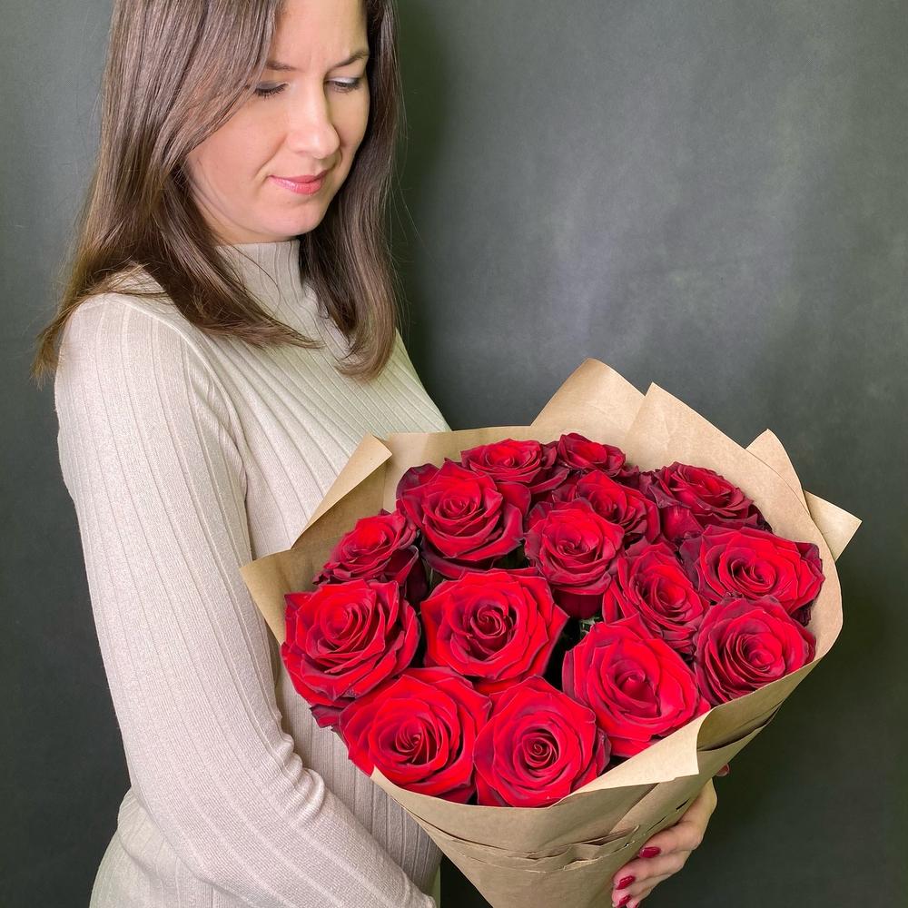 Роза Эквадор – 15 шт.Крафт упаковка – 3 шт.Лента атласная – 1 шт.