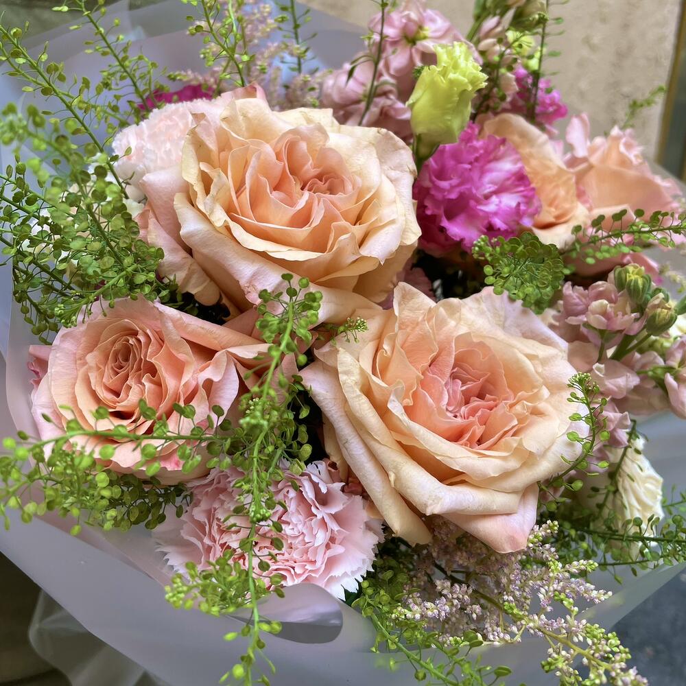 Аспидистра – 2 шт.Лизиантус – 2 шт.Маттиола – 2 шт.Гвоздика – 2 шт.Гринбелл – 1 шт.Роза шиммер – 5 шт.роза кустовая саммер роуз – 2 шт.