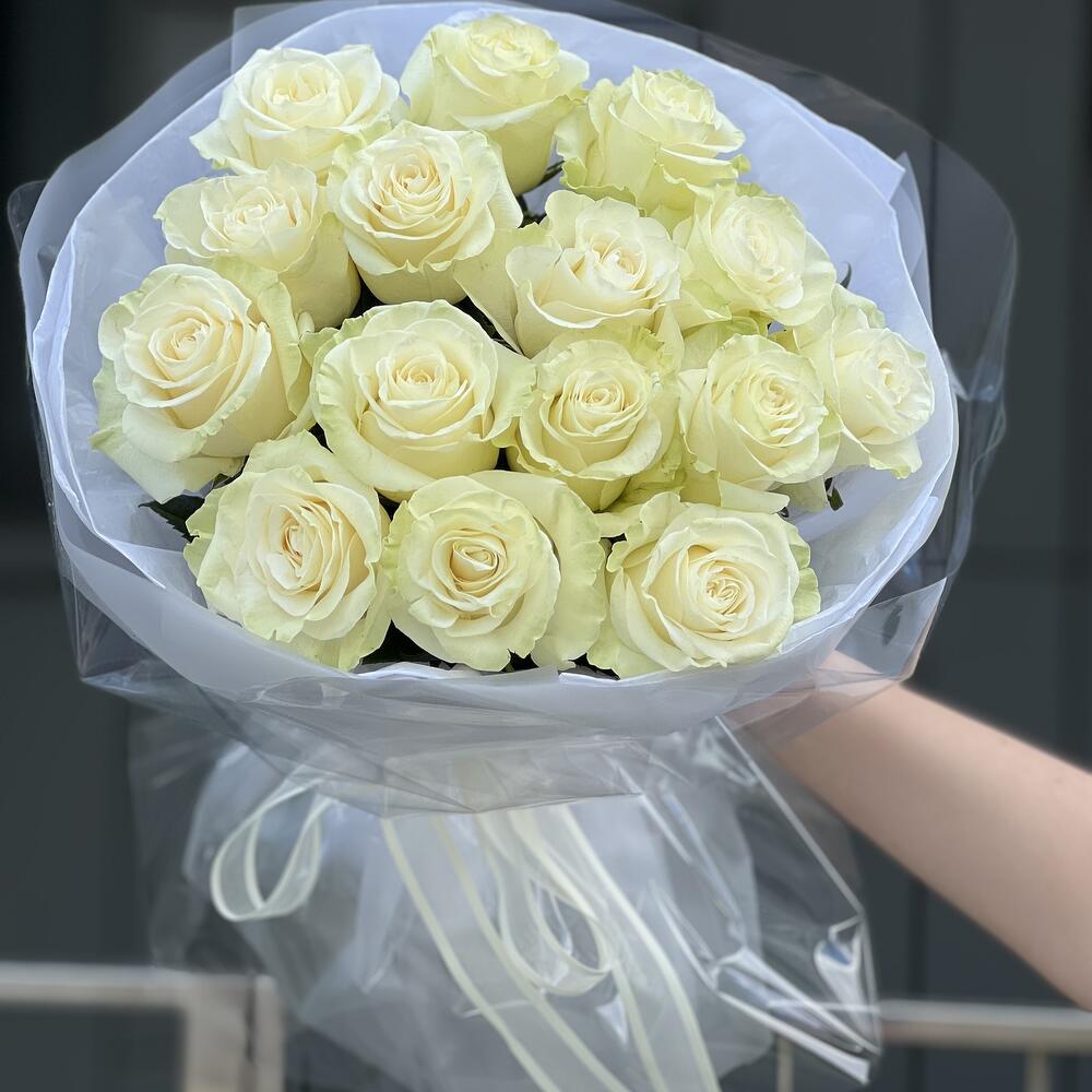 Роза белая – 15 шт. Оформление – 1 шт.