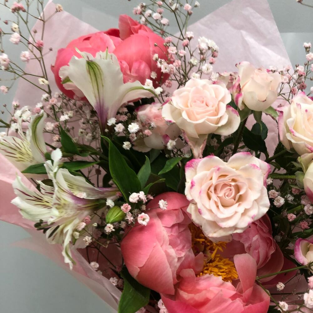 Пион – 3 шт.Роза кустовая – 1 шт.Альстромерия – 2 шт.гипсофтла – 1 шт.Тишью – 1 шт.Пленка дизайнерская – 1 шт.Лента атласная – 1 шт.