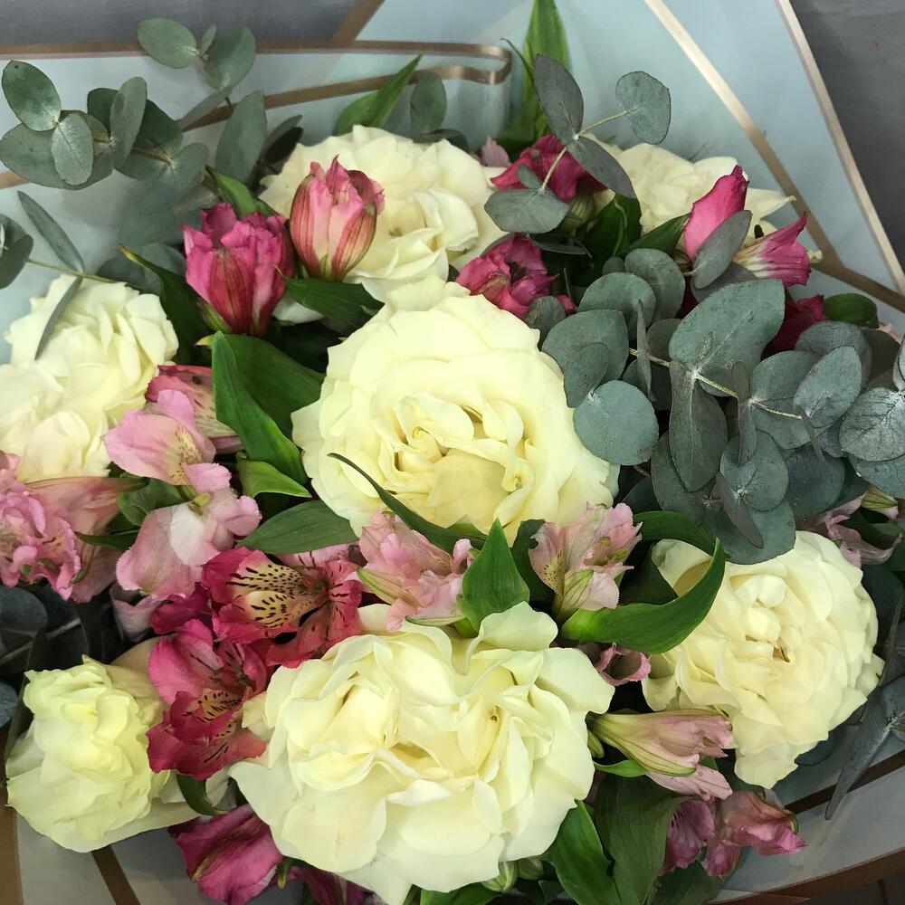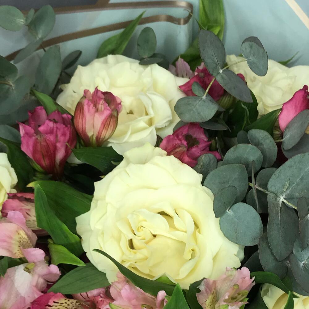 Роза – 7 шт.Альстромерия – 10 шт.Эвкалипт – 4 шт.Дизайнерская упаковка – 2 шт.