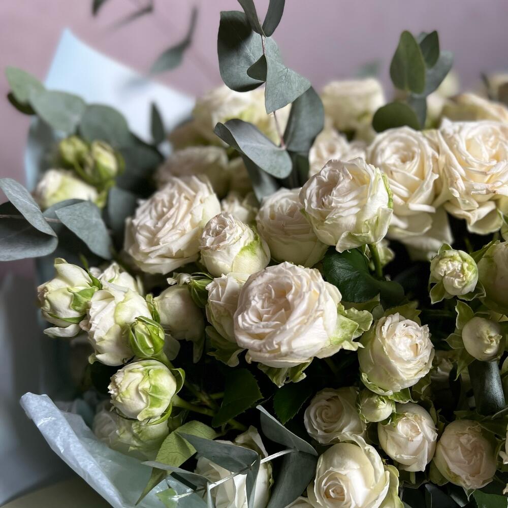Эвкалипт – 5 шт.Роза кустовая пионовидная – 15 шт.декаротивная упаковка – 3 шт.Атласная лента – 2 шт.