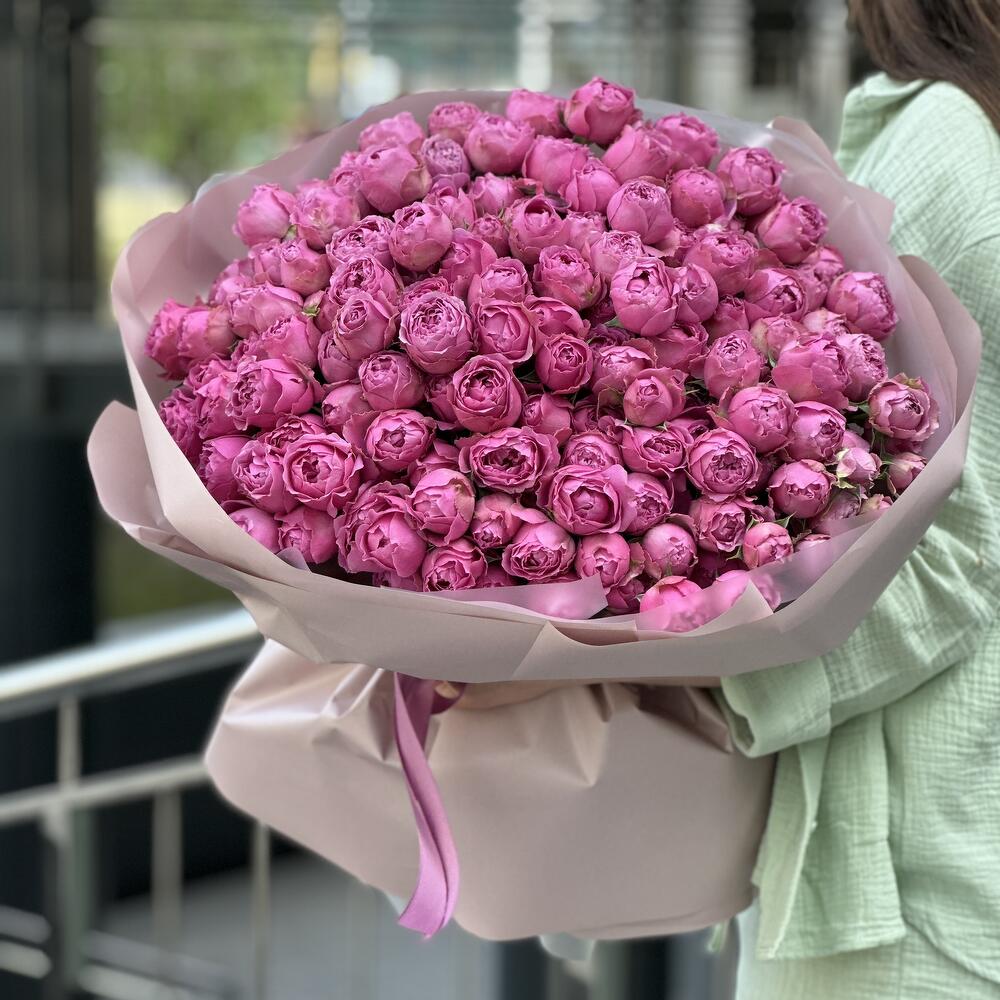 Роскошный букет пионовидных кустовых роз в оформлении!