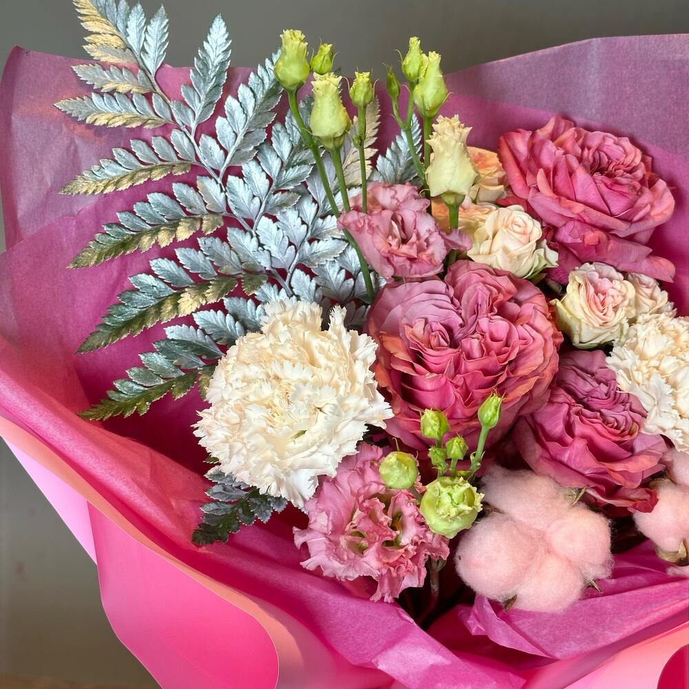 Роза кустовая – 1 шт.Хлопок – 2 шт.Гвоздика – 2 шт.Эустома – 1 шт.Лента атласная – 1 шт.Упаковка дизайнерская – 2 шт.папоротник крашенный – 1 шт.роза country blues – 3 шт.