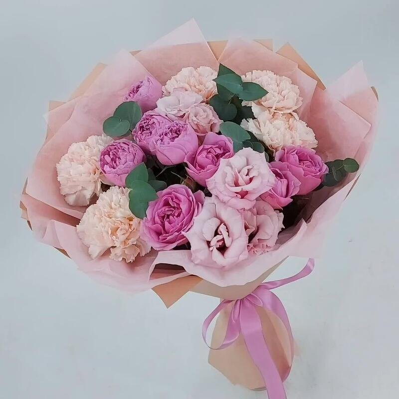 Букет с кустовыми пион. розами, эустомой и диантусами