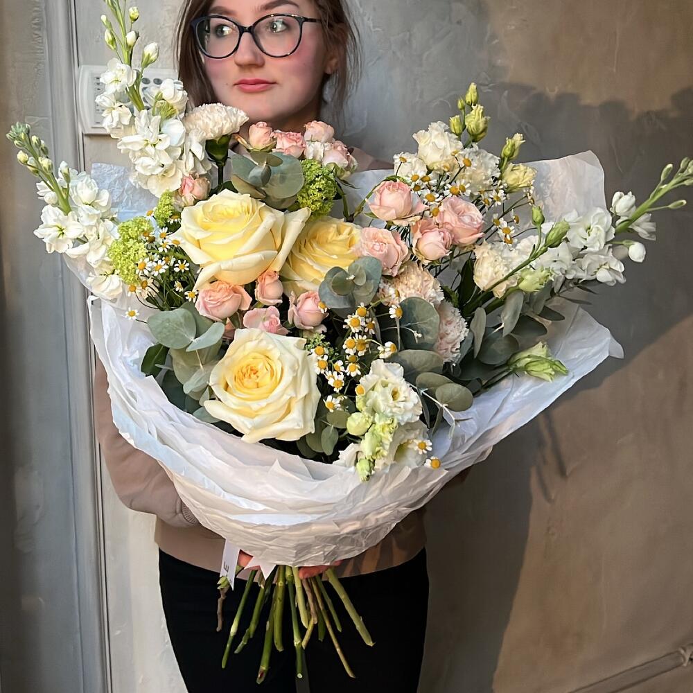 Букет с маттиолой, пионовидной розой, кустовой розой и матрикарией