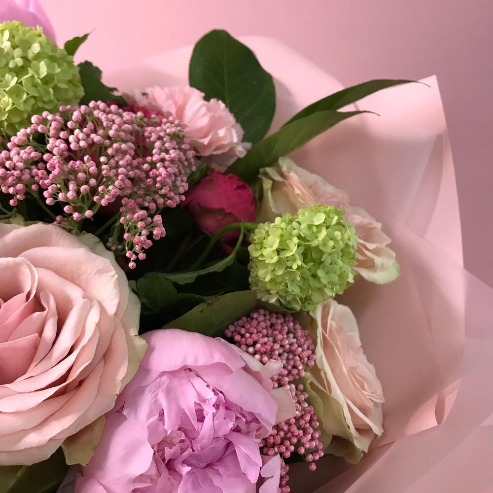 Оформление – 1 шт.Пион – 2 шт.Роза садовая – 3 шт.роза фрутетто – 3 шт.Диантус – 3 шт.Озотамнус – 2 шт.Вибурнум – 1 шт.Салал – 7 шт.