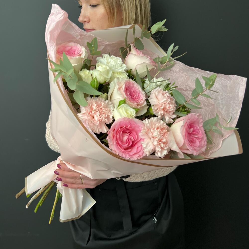 Роза кустовая – 1 шт.Эвкалипт – 1 шт.Роза Эквадор – 5 шт.Гвоздика – 5 шт.Упаковка дизайнерская – 1 шт.