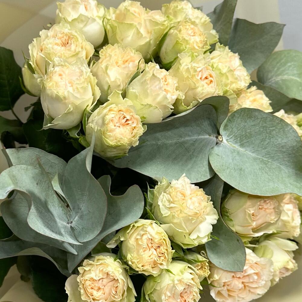 Эвкалипт – 1 шт. Кустовая пионовидная роза – 7 шт. Авторская упаковка – 1 шт.