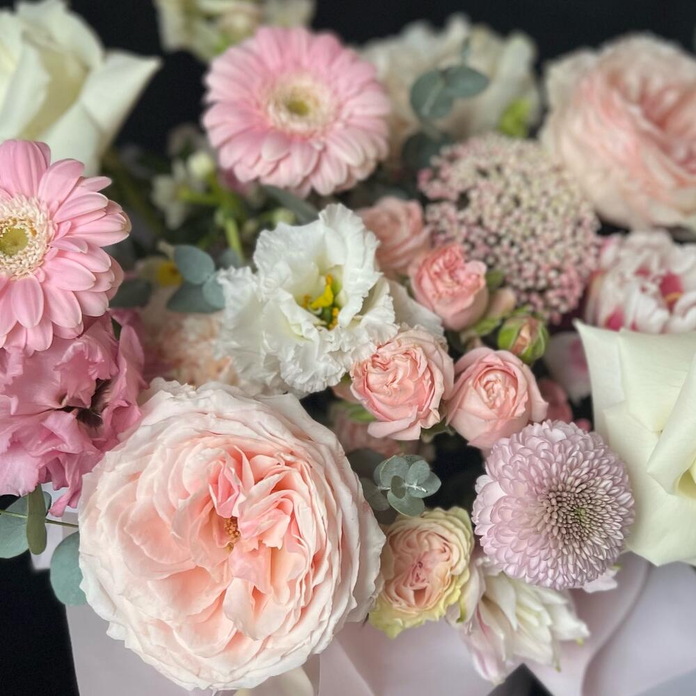Цветы в коробке из пионовидныз роз, хризантем и Гербер