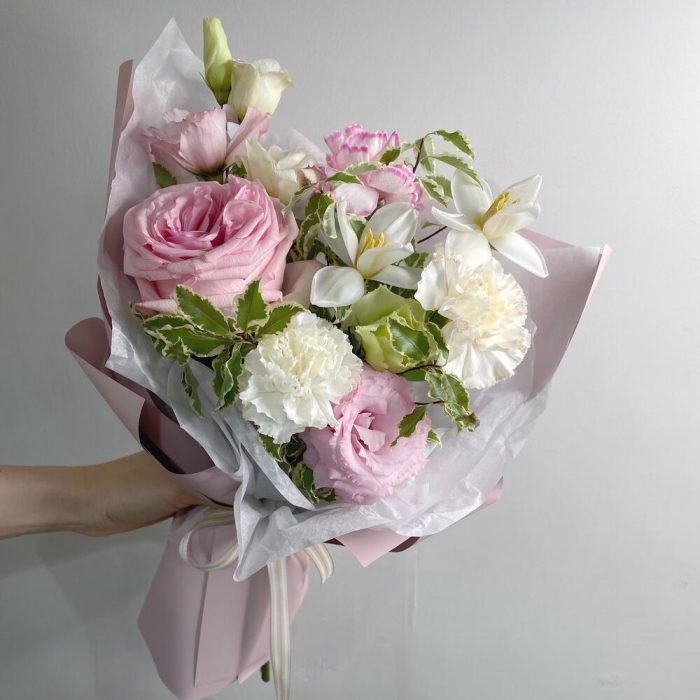 роза pink o’hara – 1 шт.Тюльпан – 2 шт.Диантус – 3 шт.Лизиантус – 1 шт.Питтоспорум – 1 шт.Упаковка дизайнерская – 1 шт.