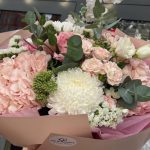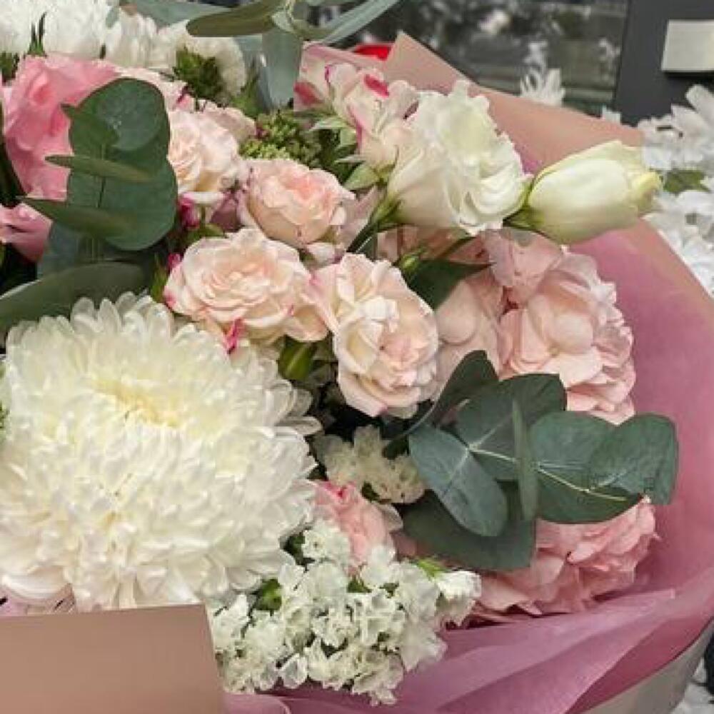 Евро-Букет из Хризантемы ,Гортензии,Лизиантусов ,Кустовой Розы и Статицы+ открытка ручной работы в подарок