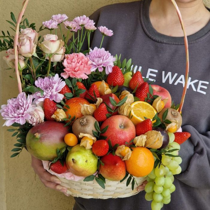 Корзина , в которой прекрасно сочетаются фрукты , ягоды и цветочная композиция.