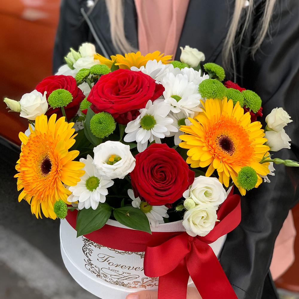 Роза красная – 3 шт. Коробка шляпная – 1 шт. Хризантема зеленая – 2 шт. Гербера желтая – 3 шт. Хризантема белая – 1 шт. эустома белая – 2 шт.