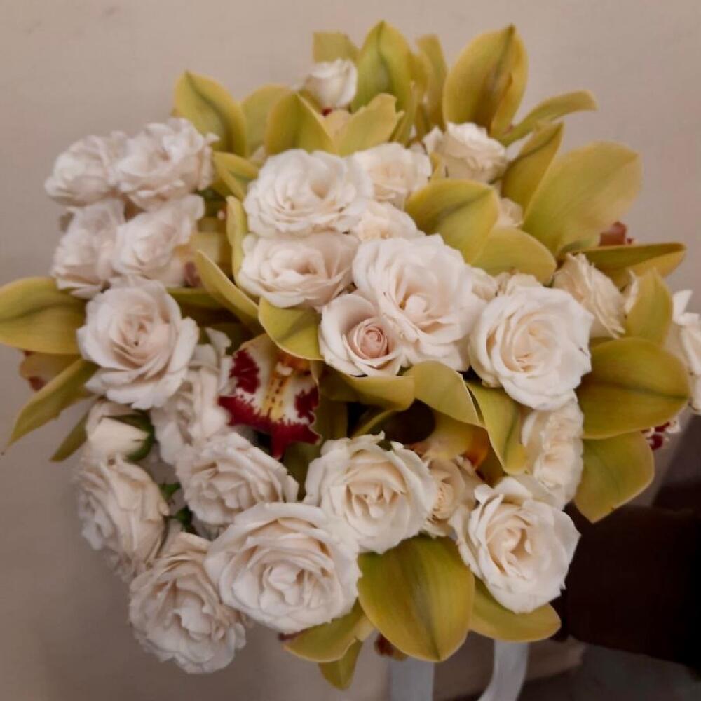 орхидея соцветия – 11 шт.Роза кустовая – 10 шт.шляпная коробка в ассортименте – 1 шт.Оазис флористический – 1 шт.