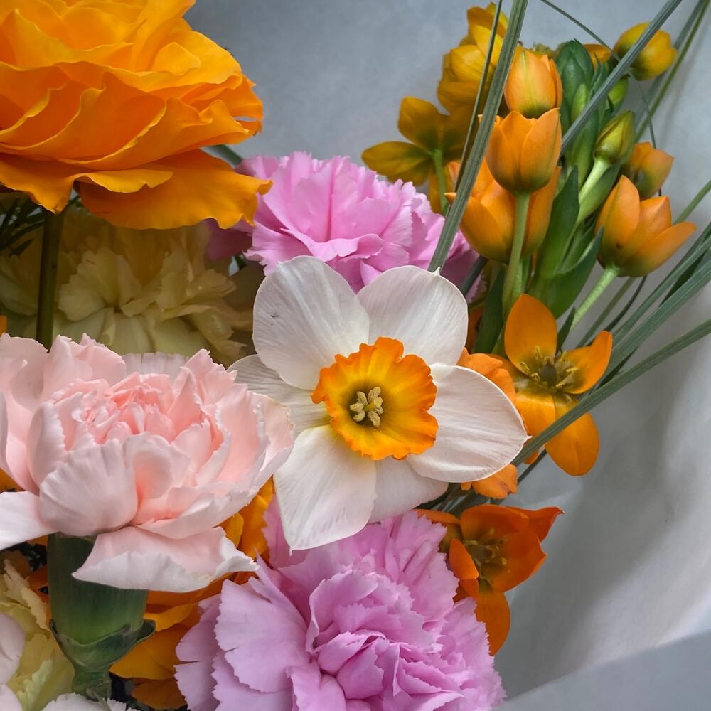 Нарцисс – 1 шт.Роза – 3 шт.Гвоздика – 8 шт.Орнитогалум – 2 шт.бергарасс – 1 шт.аспарангус – 2 шт.
