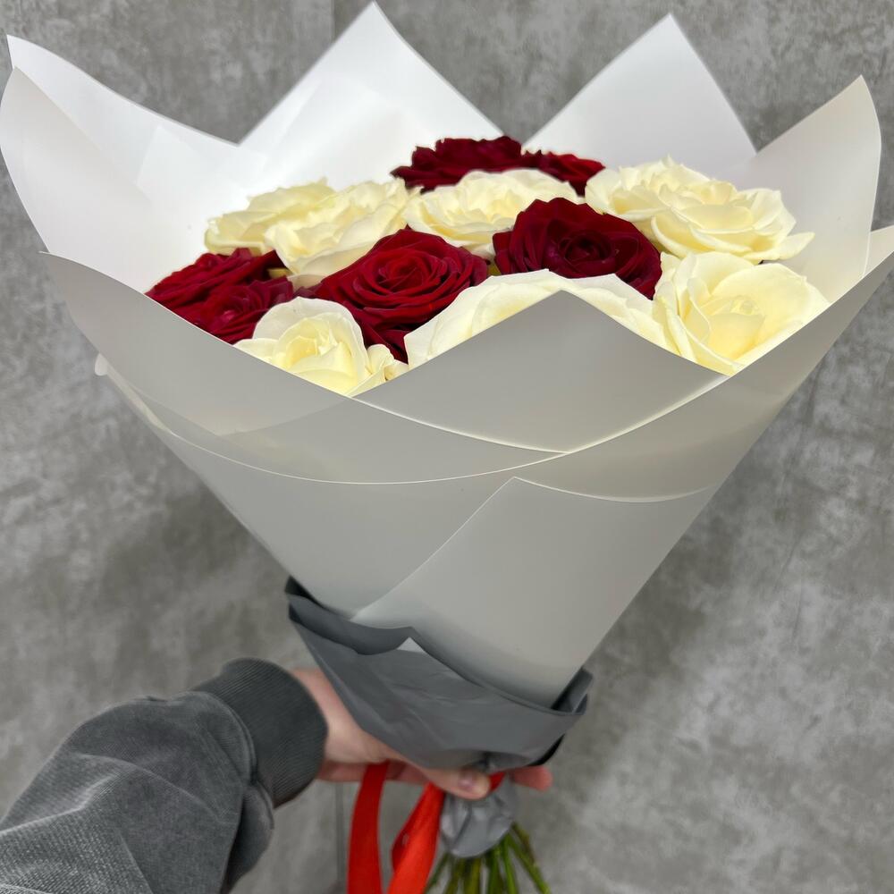 роза красная ред наоими – 7 шт.Роза белая аваланж – 8 шт.Упаковка дизайнерская – 1 шт.Лента – 1 шт.