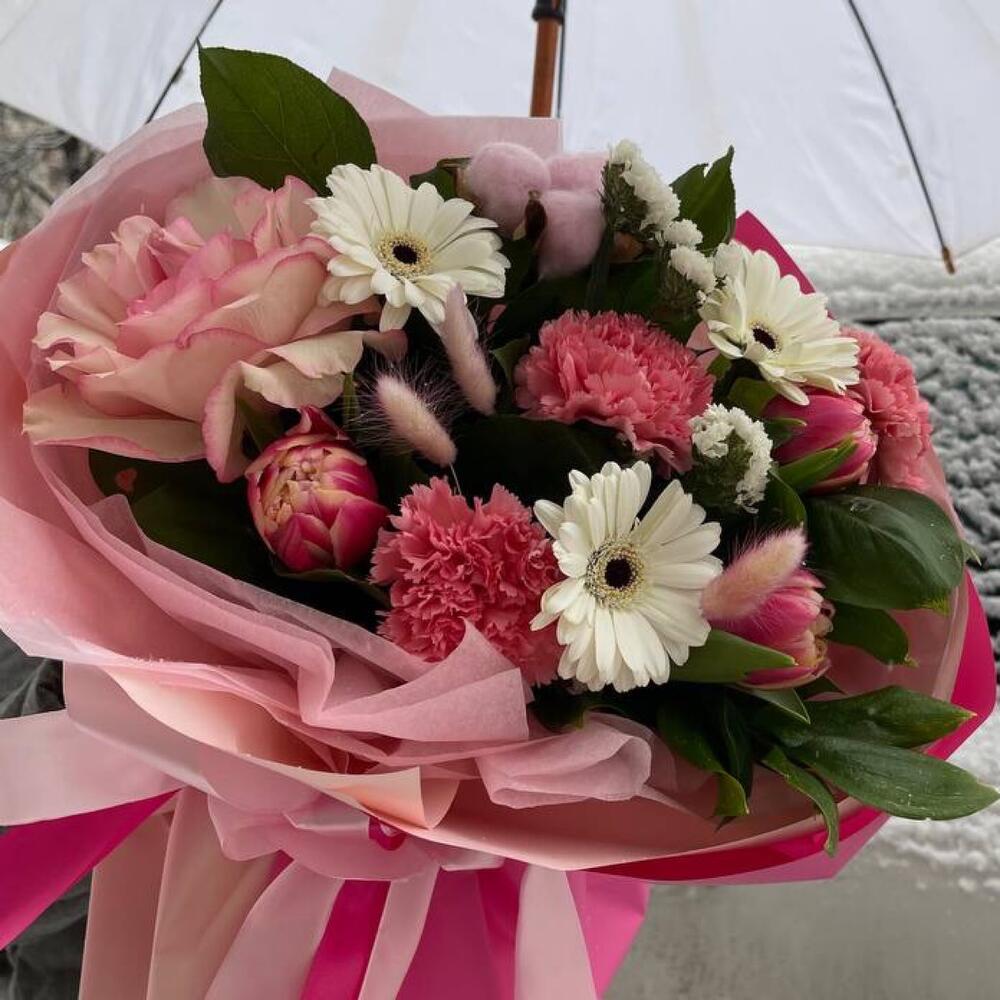 Гербера мини – 3 шт.Роза французская – 1 шт.Тюльпан пионовидный – 3 шт.Статица – 1 шт.Гвоздика сортовая – 3 шт.Хлопок (сухоцвет) – 1 шт.Лагурус – 3 шт.Пленка матовая – 6 шт.Тишью розовая – 4 шт.