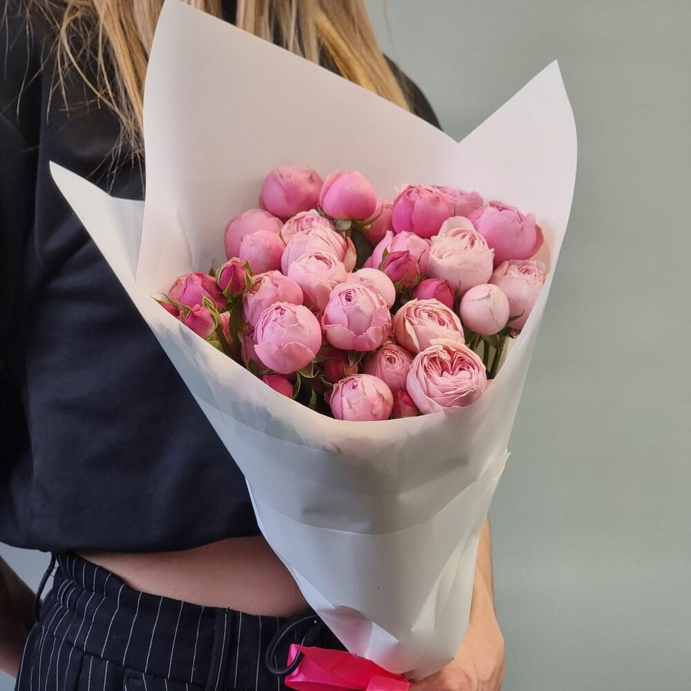 Небольшой букет из 5-ти пионовидных розочек в матовой плёнке для подарка на любой повод или просто так.