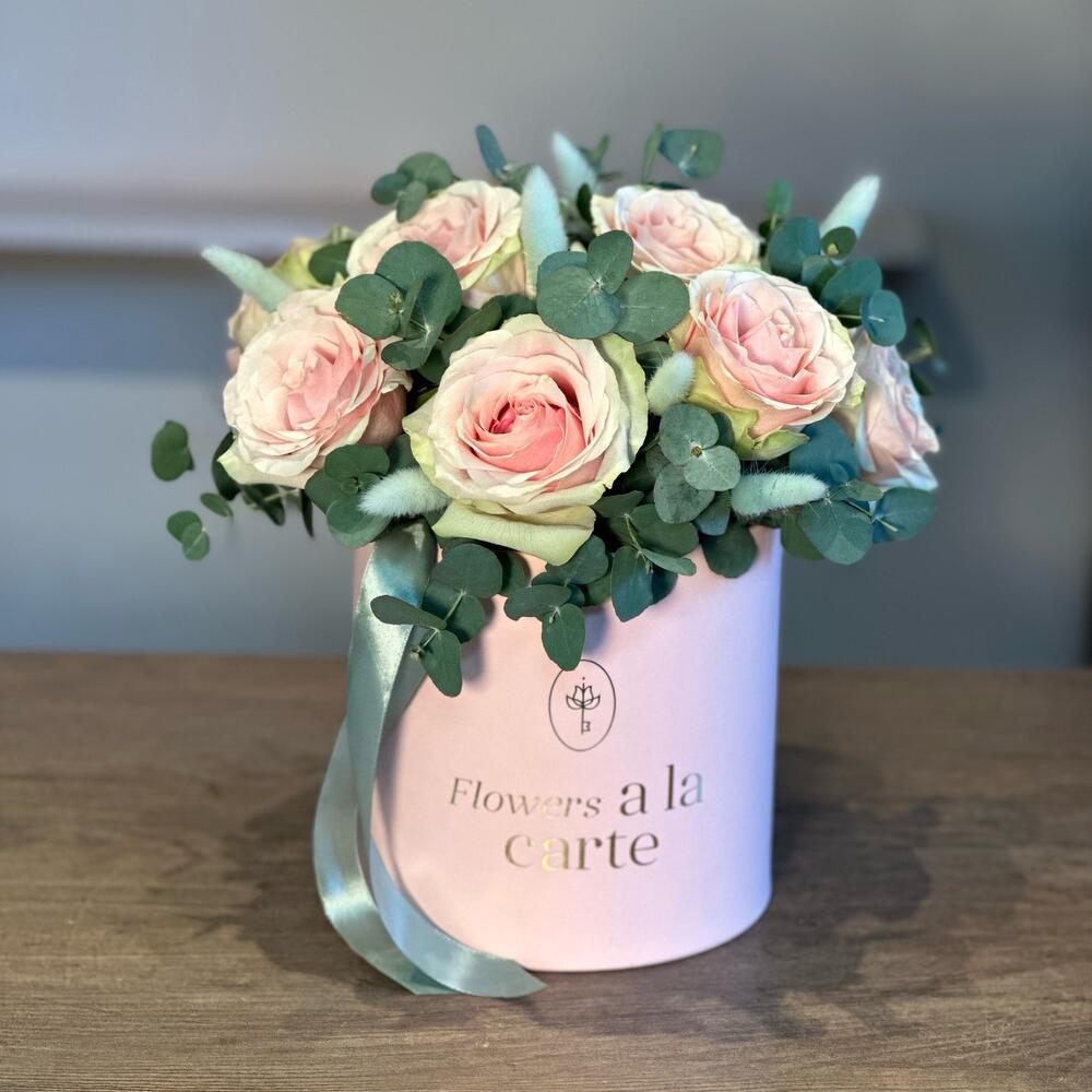 Красивая композиция из розовых роз, эвкалипта и лагуруса в шляпной коробке
