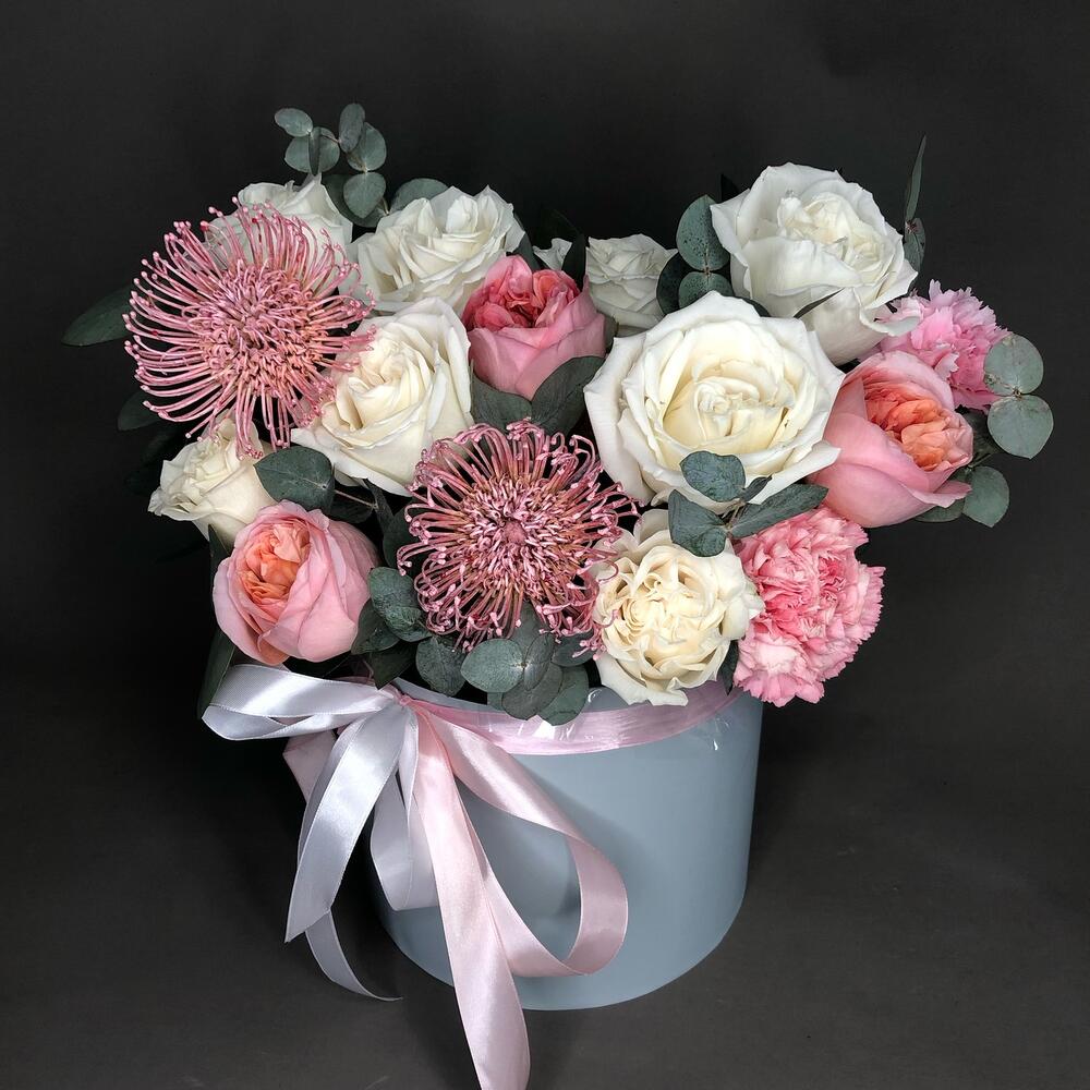 Роза пионовидная – 11 шт.Эвкалипт – 4 шт.Диантус – 3 шт.леукоспермум розовый – 2 шт.Оазис флористический – 2 шт.Коробка – 1 шт.Лента атласная – 3 шт.