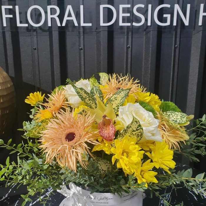 Гербера – 6 шт. Роза – 2 шт. Хризантема кустовая – 7 шт. зелень экзотика – 3 шт. Диантус – 3 шт. Орхидея Цимбидиум – 3 шт. Фисташка пучок – 3 шт. Оазис флористический – 1 шт. Коробка шляпная – 1 шт.