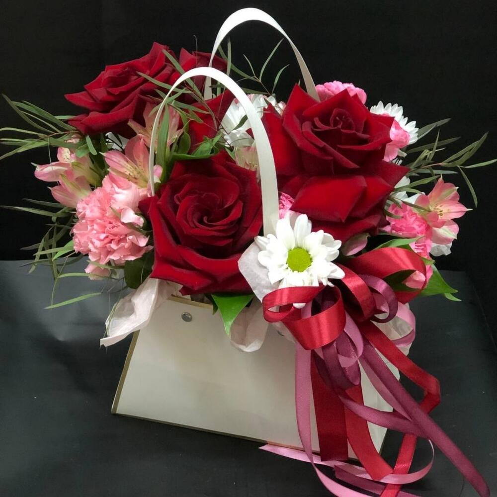 Альстромерия – 1 шт.Рускус – 4 шт.Хризантема кустовая – 1 шт.Роза – 3 шт.Лента атласная – 4 шт.Диантус – 3 шт.Сумочка – 1 шт.Оазис флористический – 1 шт.эвкалипта – 1 шт.