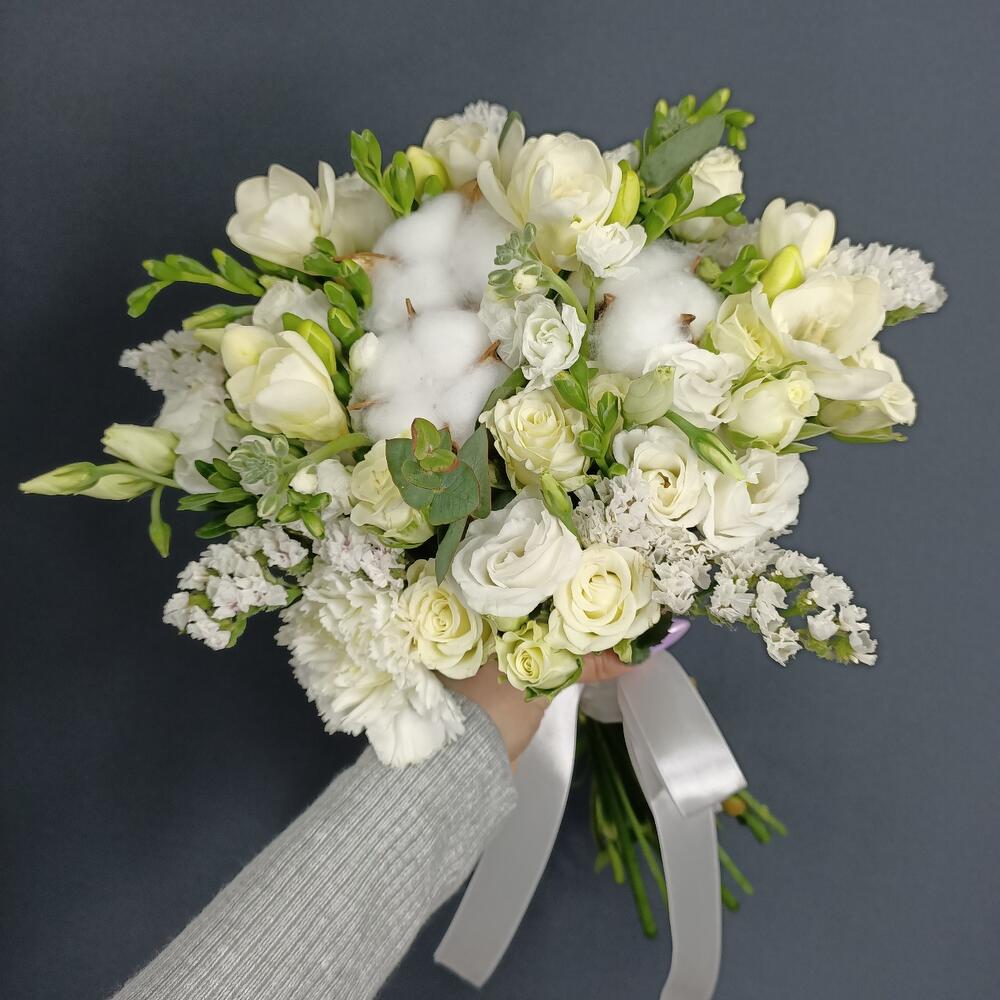 Хлопок – 3 шт.Фрезия – 10 шт.Роза кустовая – 5 шт.Лизиантус – 3 шт.Статица – 2 шт.Гвоздика – 1 шт.Эвкалипт – 1 шт.Лента атласная – 3 шт.