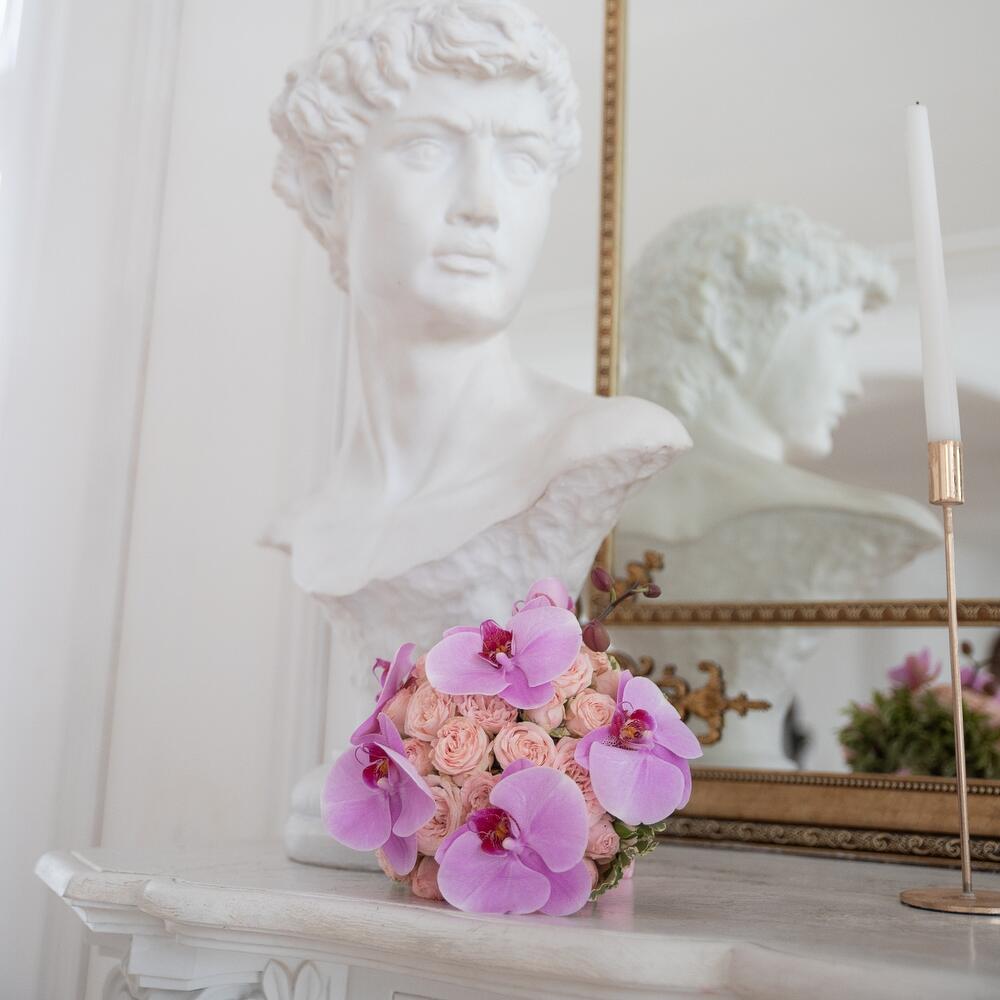 Питтоспорум – 1 шт.Роза кустовая – 9 шт.Лента атласная – 2 шт.Фаленопсис – 2 шт.