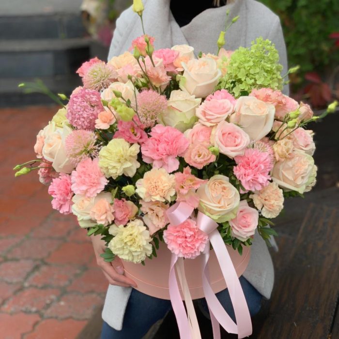 Роза кустовая – 5 шт.Лента атласная – 3 шт.Диантус – 23 шт.Коробка шляпная – 1 шт.Фисташка – 10 шт.Роза пионовидная – 11 шт.Диантус кустовой – 3 шт.Лизиантус розовый – 8 шт.Декоративные цветы – 5 шт.Оазис флористический – 3 шт.