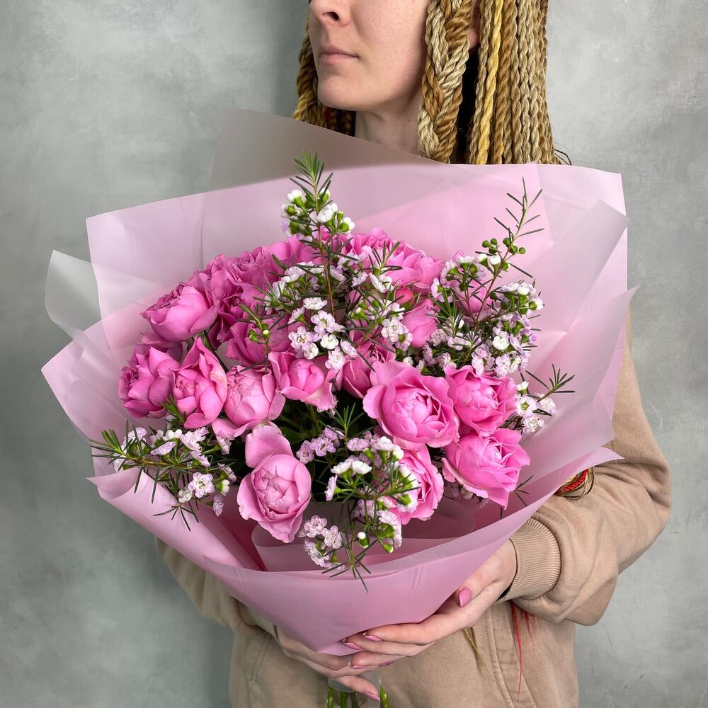 Ваксфлауэр – 2 шт.Роза пионовидная кустовая – 5 шт.Упаковка дизайнерская – 1 шт.