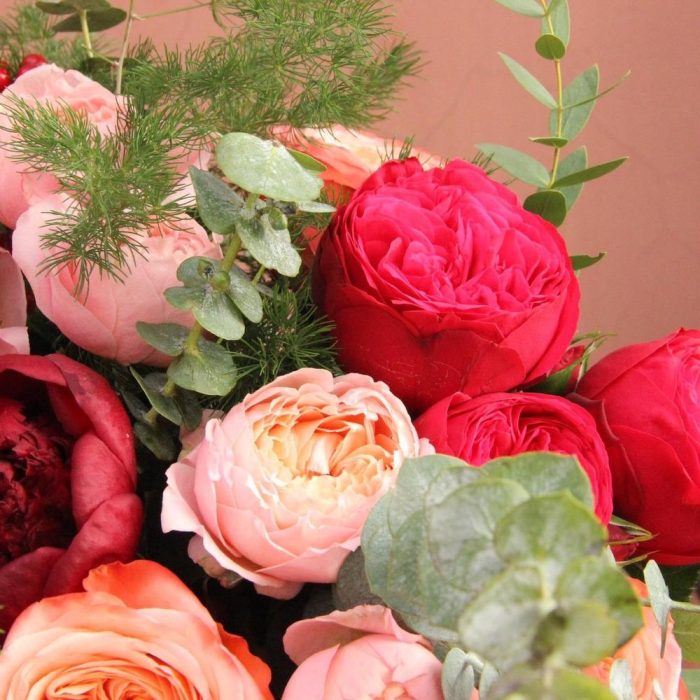 Яркий красочный букет с пионовидными розами, калиной, эвкалиптом и аспарагусом .Стильное цветочное решение для любого случая.