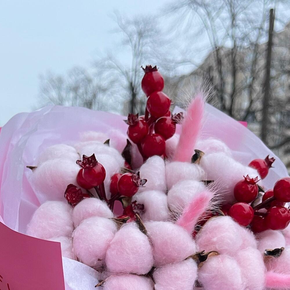 Пленка матовая – 4 шт.Хлопок натуральный – 11 шт.Тишью белое – 4 шт.Лагурус (сухоцвет) – 3 шт.наклейка с пожеланием – 1 шт.ветки декор с глитером – 3 шт.