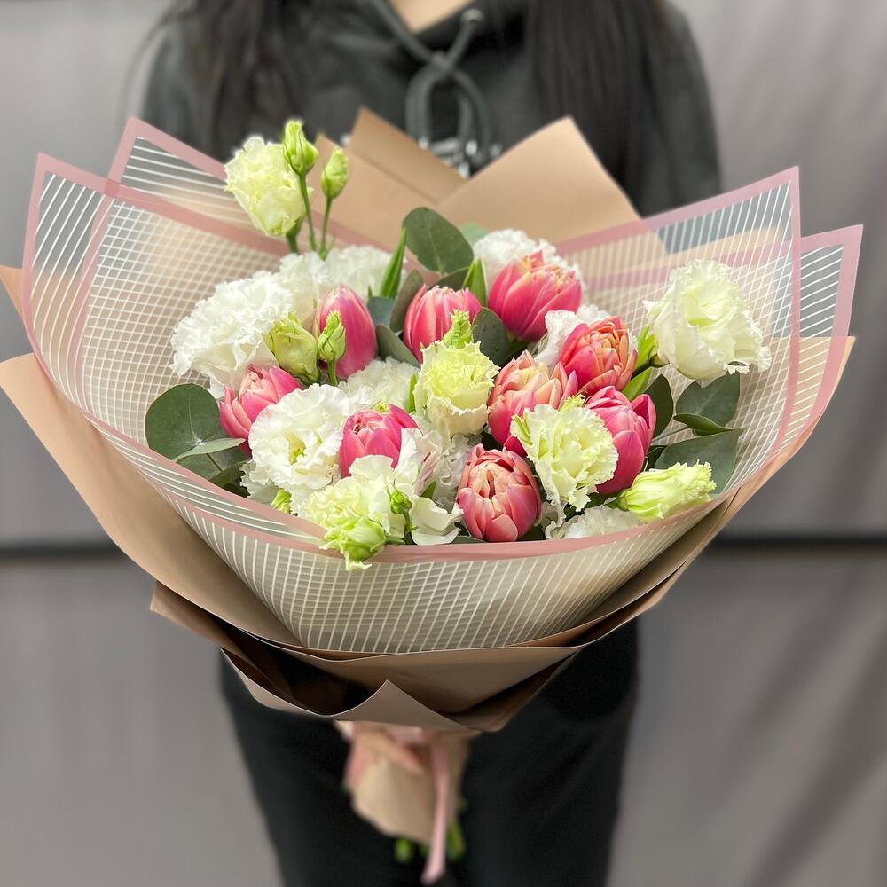 Тюльпан пионовидный – 9 шт.Эустома белая махровая – 3 шт.Эвкалипт – 2 шт.Пленка матовая – 5 шт.Лента атласная – 2 шт.
